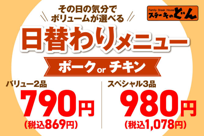 『ステーキのどん』日替わりメニューをリニューアル!!メイン2品の「バリュー日替わり」790円(税込869円)が新登場!曜日ごとにボ…