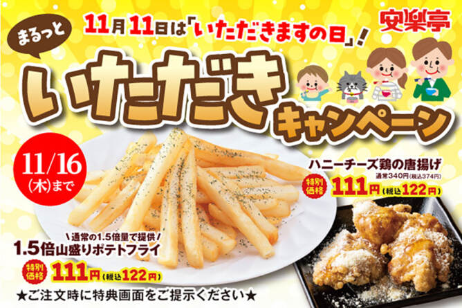 山盛りポテトや唐揚げが税別111円!「まるっといただき!キャンペーン」を11月16日まで開催中!
