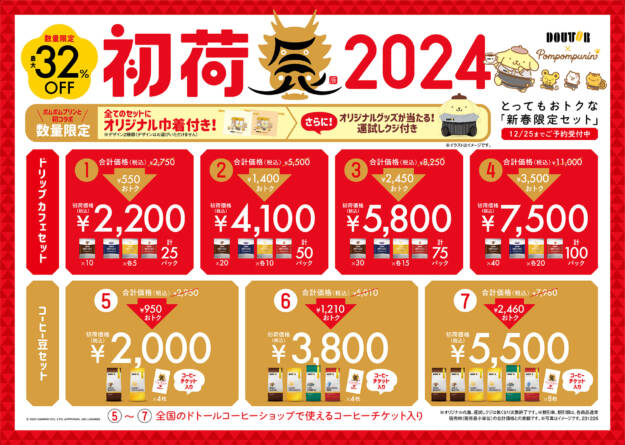 ドトール×ポムポムプリン オリジナルグッズが抽選で当たる! 新春限定セット「初荷2024」 11月8日(水)予約開始