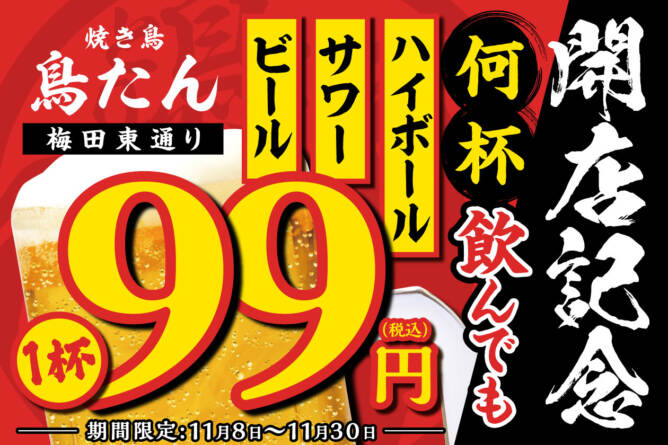 【生ビール・ハイボール・サワーが何杯飲んでも1杯99円】オープンを記念して「焼き鳥 鳥たん 梅田東通り」にて11月8日(火)~30…