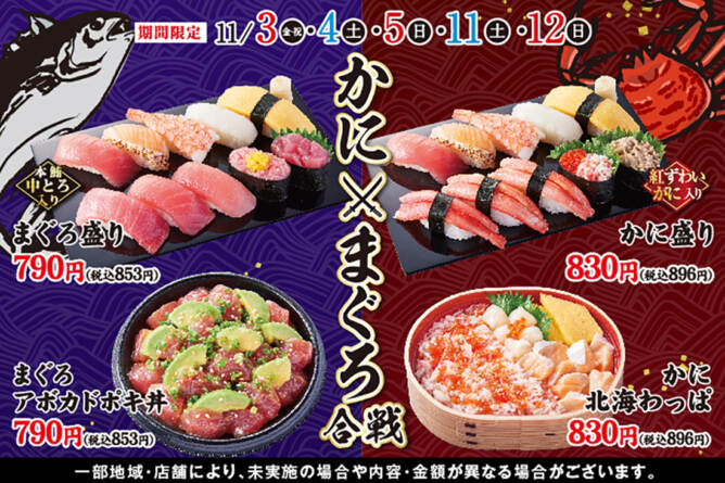 11/3(金・祝)~!小僧寿しでは、季節の食材「かに」と人気の食材「まぐろ」をメインに『かにまぐろ合戦』を開催します!