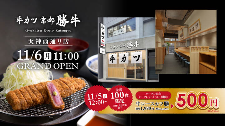 【1日限定・数量限定】OPEN記念“牛カツ500円イベント”開催!「牛カツ京都勝牛 天神西通り店」11月6日(月)移転オープン決定…