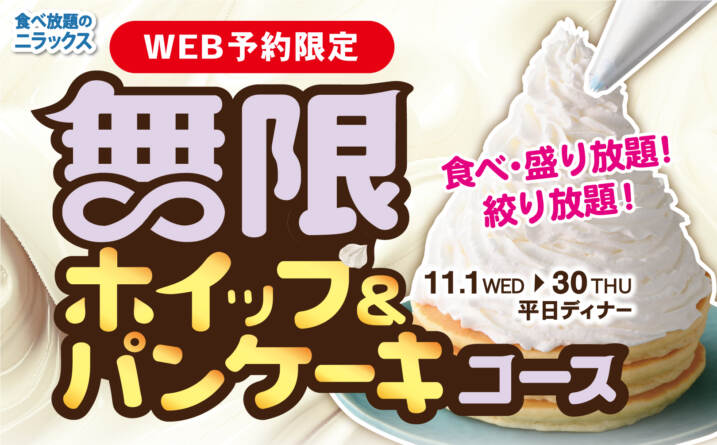 【盛り放題‼絞り放題‼ 無限にホイップクリーム&パンケーキ食べ放題‼ 】11/30迄の平日ディナー予約限定!ニラックスブッフェ2店…
