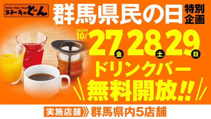 【ステーキのどん】10月28日(土)は群馬県民の日!群馬県内5店舗で10月27日(金)~29日(日)はドリンクバーを無料開放します…
