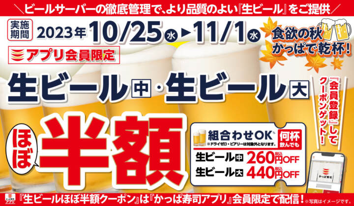 【かっぱ寿司アプリ会員限定】明日(10/25)より生ビールがほぼ半額の8日間食欲の秋に乾杯! 何杯飲んでも「生ビールほぼ半額キャン…