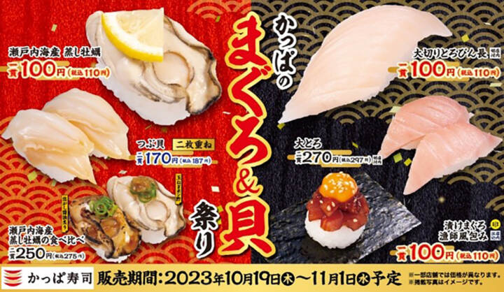 かっぱ寿司、“大切りとろびん長” “漬けまぐろ” “蒸し牡蠣” “つぶ貝”などを堪能する14日間 多彩な「まぐろ&貝」を110円よ…
