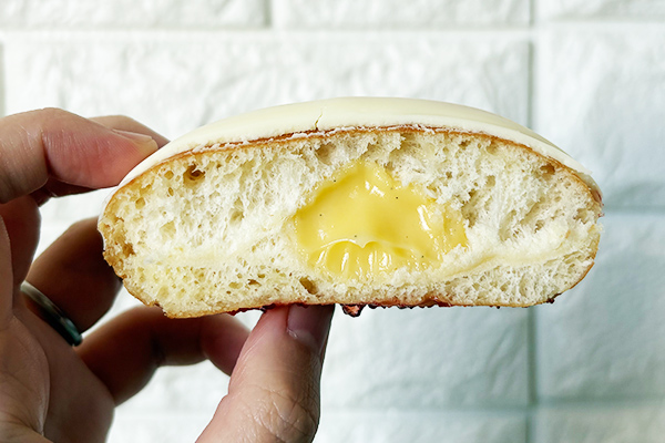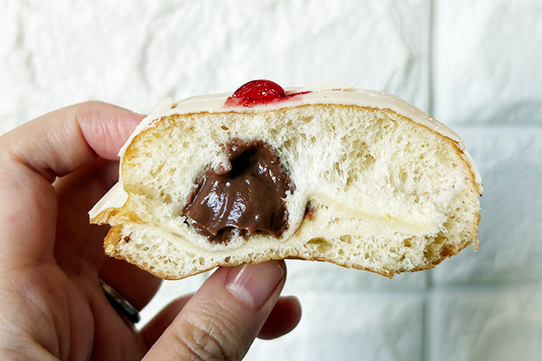 中には生チョコ入りのなめらかチョコクリームが入っており、ひと口で濃厚リッチな気分に。マフラーをイメージしたストロベリーナパージュの酸味が後味をすっきりまとめてくれるますね。冬のドーナツでここまで“表情”がしっかりしているのはKKDならではの魅力。