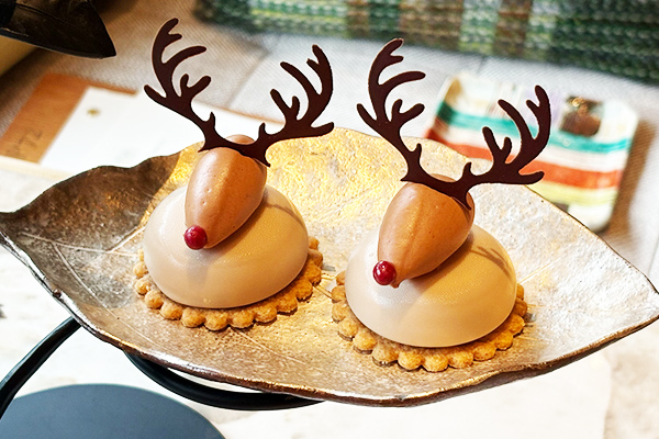 その上で、スイーツとセイヴォリーが小さな物語のように可憐に並び、クリスマス気分が一気に高まります。