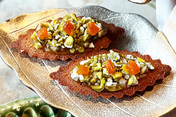 小ぶりながら素材の香りがくっきりと立ち、質の高さを感じるミニスイーツ。ピスタチオの香ばしさ、セミドライアプリコットの甘酸っぱさが良いアクセントに。