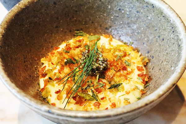 じゃがいもと葱のエスプーマ とんぶりとじゃがいものクランブル