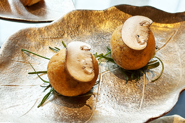黒毛和牛ほほ肉と淡路玉葱のフリット 発酵茸のピューレ
