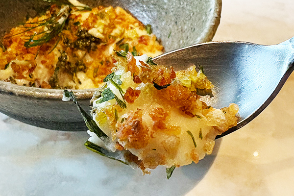 軽やかなザクザク食感、プチプチ食感がたまらない。じゃがいものほっこり感、冬らしい香りが寄り添う、リズムのあるセイヴォリー。