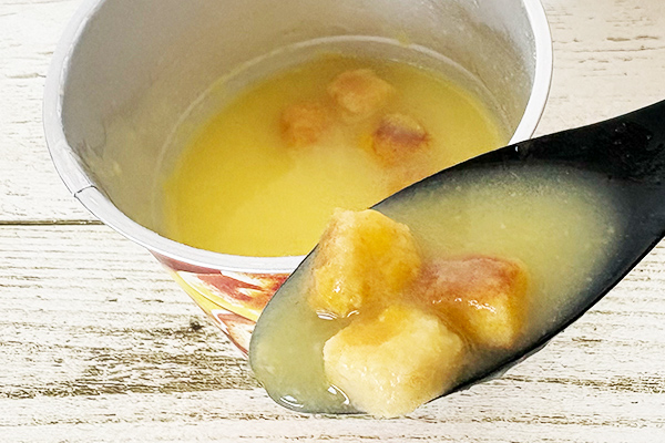注目はパンのサクサク食感。スープを吸ってもふやけすぎず、最後まで心地よい軽さが続くのが新鮮。