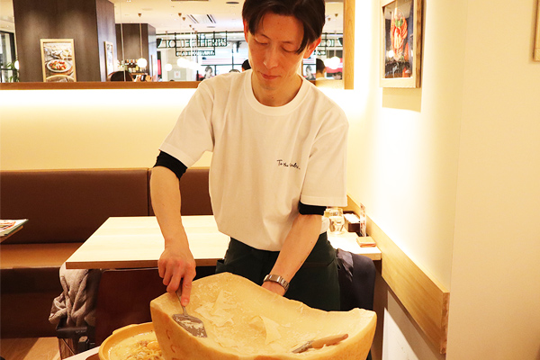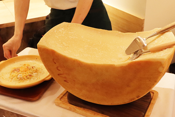 DOP認定“24ヶ月熟成パルミジャーノ・レッジャーノ”を目の前で削るワゴンサービスは見応え抜群。カルボナーラやリゾットが贅沢な一皿に仕上がります。