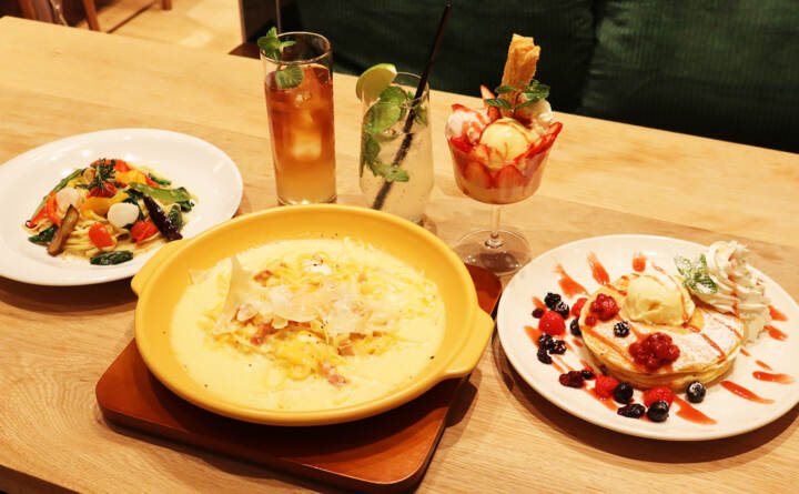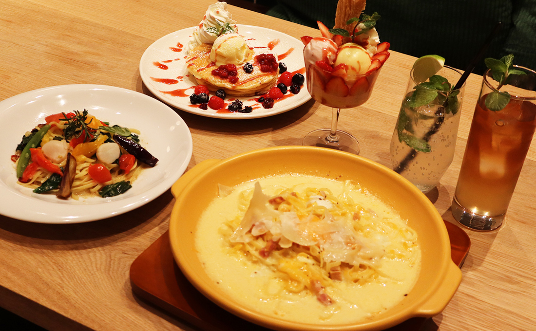 スイーツは注文後に焼き上げるふわふわパンケーキや、果実たっぷりのパフェ、さらに茨城県産シルクスイートを使った限定スイーツも登場。買い物帰りのひと休みや、友人とのランチ・ディナーにもぴったりな新スポットです。