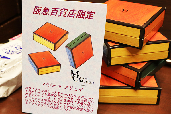 「パヴェ オ フリュイ」は阪急百貨店限定の味わい。パリ本店前のユニヴェルシテ通りの石畳をイメージしたショコラです。コクのあるショコラにクリームを合わせ、まろやかな味わいに仕上げました。