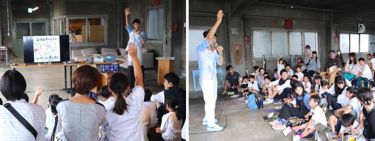 当日はあいにくの雨で、「施肥(海への肥料まき)」の見学は中止となりましたが、屋内にて「さかなのおにいさん かわちゃん」によるスペシャルワークショップを開催。会場は子どもたちの元気な声であふれ、イワシや海の生き物のクイズやトークを通して、海の環境や命のつながりについて楽しく学ぶ時間となりました。