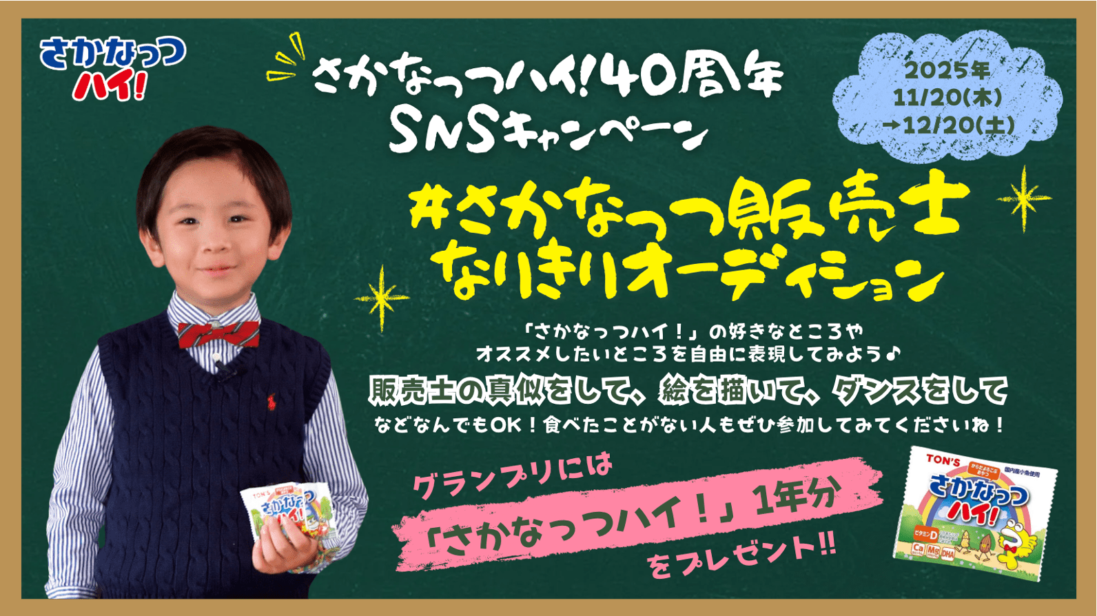 東洋ナッツ食品株式会社(本社:兵庫県神戸市東灘区)は、今年40周年を迎えるロングセラー商品『さかなっつハイ!』の子ども向け新企画「#さかなっつ販売士なりきりオーディション」を2025年11月20日(木)より開始。最優秀賞に選ばれた方には『さかなっつハイ!』1年分をプレゼントします。