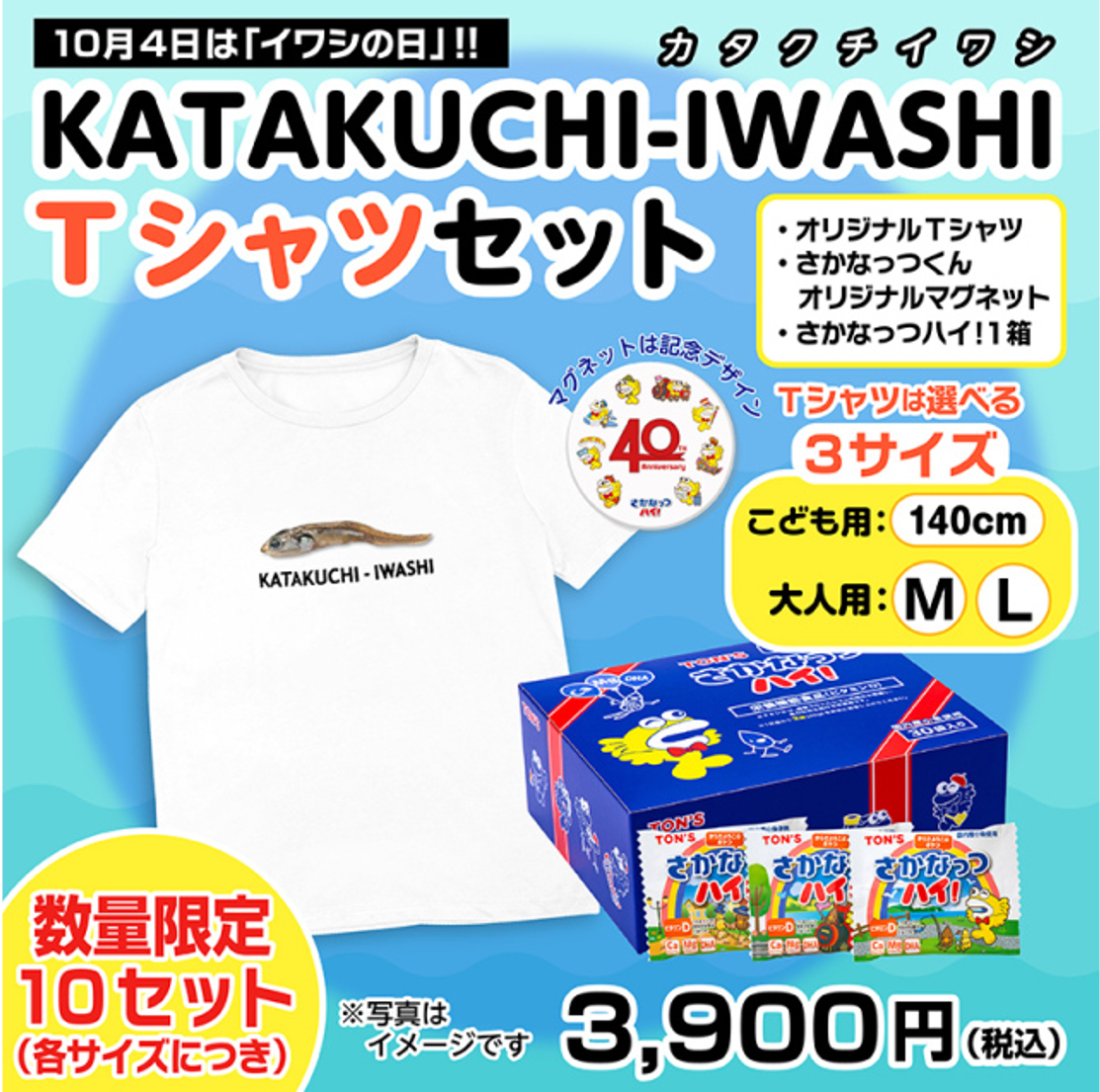 リアルなカタクチイワシが目を引くデザインの「KATAKUCHI-IWASHI Tシャツセット」、人気キャラクター『さかなっつくん』を大胆にプリントした「さかなっつくんTシャツセット」、赤い蝶ネクタイがチャームポイントの『さかなっつくん』になりきれる「なりきりTシャツセット」(子ども用のみ)の3種類をラインナップ。
