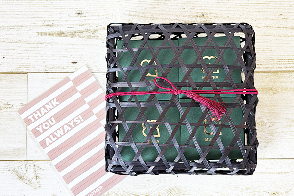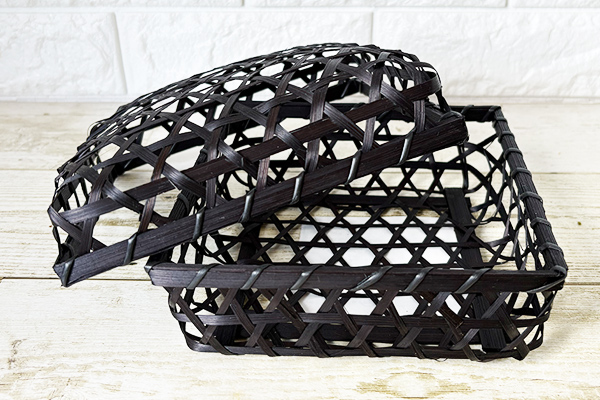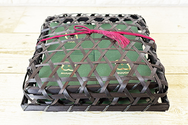宇治抹茶を思わせる深緑の個包装箱に、黒の竹籠を組み合わせた完成度の高いパッケージ。あえて粗く編まれた竹籠の隙間から中箱がのぞき、抹茶パイの編み込みを連想させる遊び心も。和の趣とスタイリッシュさを兼ね備え、作り手の丁寧な仕事が伝わる、贈り物にも最適な一品です。