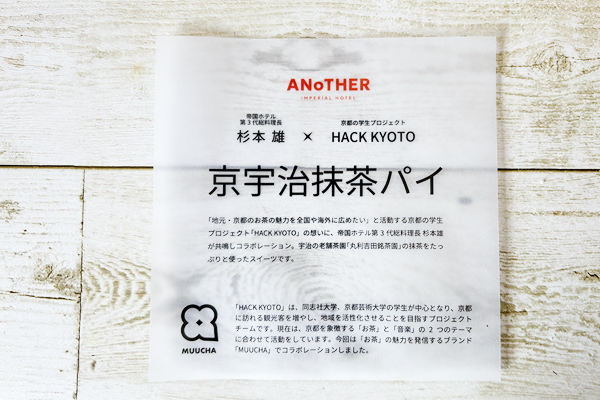 帝国ホテル 第3代総料理長・杉本雄氏と、京都の学生プロジェクトから生まれたブランド「MUUCHA(ムーチャ)」が共同で開発した、“世代と立場を越えた共創スイーツ”なのです。