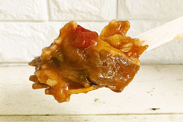 スプーンですくってひと口食べると、すぐに「これは良い意味で白ごはんと合うように計算された味だ」と感じました。トマトの主張は控えめで、牛肉と野菜の旨みが前面に出ています。