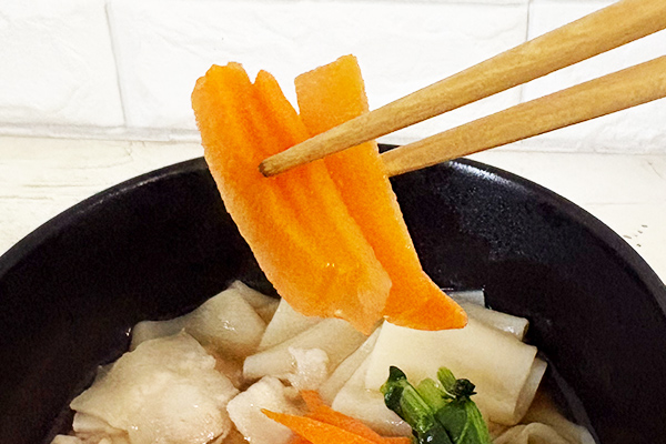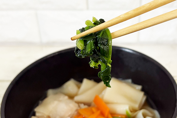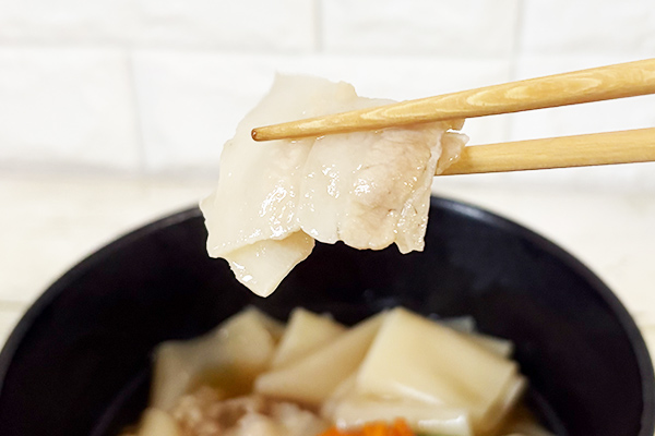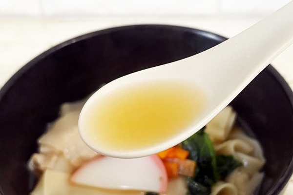 ひと口すすってみると、舌の上を滑るような「つるん」とした食感が広がります。平打ち麺特有のもちもち感はありながら、重さは感じられず、後味は軽やかです。開発段階では「薄さ」と「耐久性」という相反する課題に苦戦したそうですが、その試行錯誤の成果がしっかりと伝わってきます。