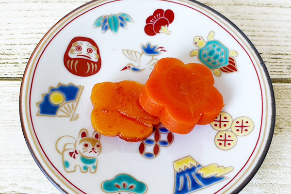 「国産梅花にんじん煮」が彩りを添え、季節感とお祝い感を演出。