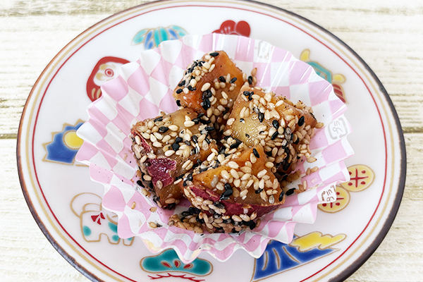 ほっくり甘い紅はるかに、ごまの香ばしさがアクセント。自然な甘みで、おやつ感覚でも楽しめる一品。大人が食べても満足感があります。