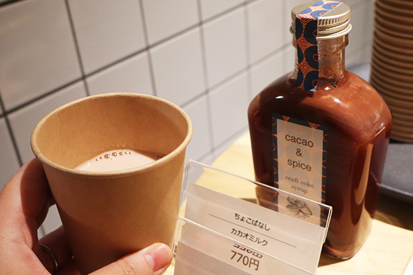 カカオミルクは、ミルク割りを試飲させていただきました。カカオの芳醇な香りとスパイスが効いた味わいは、身体も喜ぶ美味しさ。ソーダ割りやお湯割りが美味しいのは勿論のこと、マヨネーズと混ぜて唐揚げのディップソースにしても美味しいとのこと。