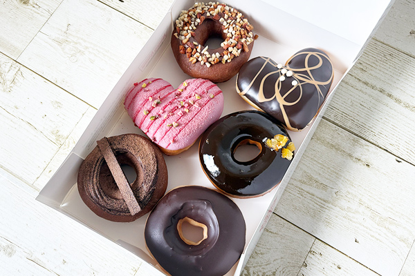 ボックスを開けると、ハート型のドーナツや艶やかなチョコレートコーティングが目に入り、バレンタインらしい華やかさが広がります。6個入りながら、一つひとつが主役級の存在感です。