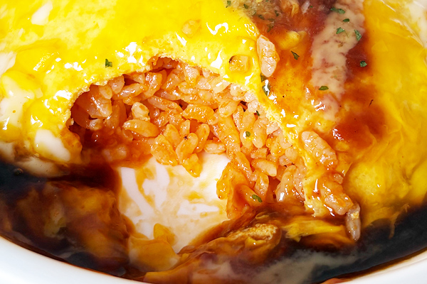 バターが香るケチャップライスに、とろとろ食感のたまご、そして濃厚デミグラス。たまごは牛乳や生クリーム入りで、口当たりなめらか仕立て。王道オムライスを“ふわっとろ〜”方向に寄せた一品です。