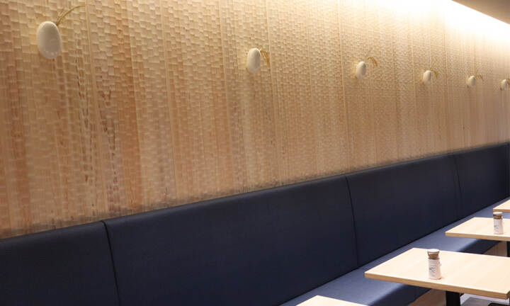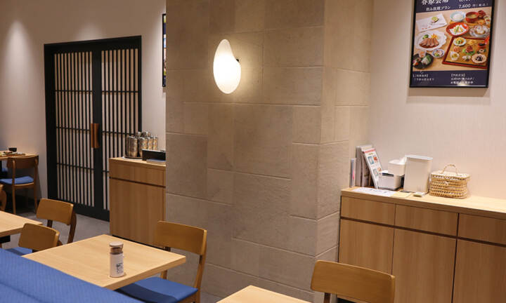 奥へ進むと、落ち着いた空間が広がります。ソファーの生地を切り替え、お米をモチーフにした花器や稲穂の装飾、ブランドのシンボルマークを配置することで、印象的な空間演出を実現しています。