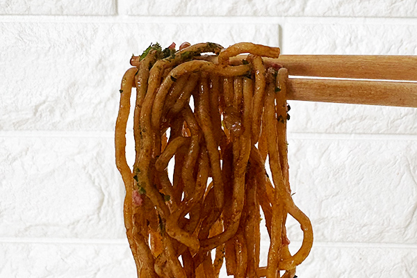 通常のU.F.O.より約114%太くなった“ぶっといもちもち麺”。箸で持ち上げた瞬間に伝わる重量感、そして口に運んだときのもっちりとした弾力が印象的です。