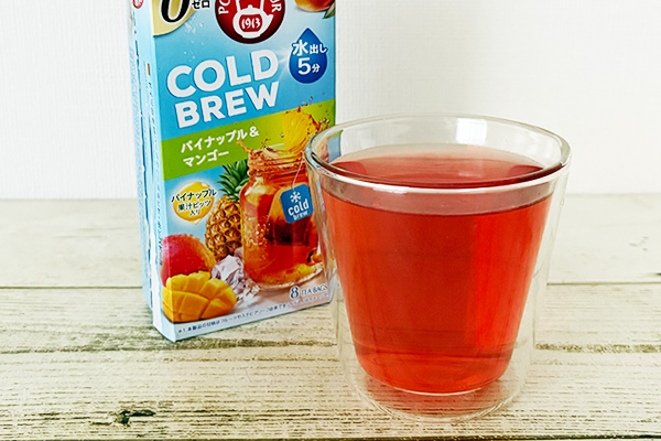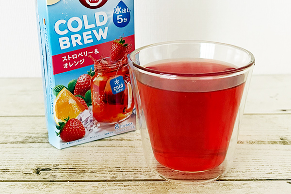 まず驚いたのは、その手軽さ。ティーバッグをボトルに入れて水を注ぐだけで、約5分後にはしっかりと色づいたフルーツティーが完成します。忙しい朝や外出前でもサッと用意できるのがうれしいポイント。