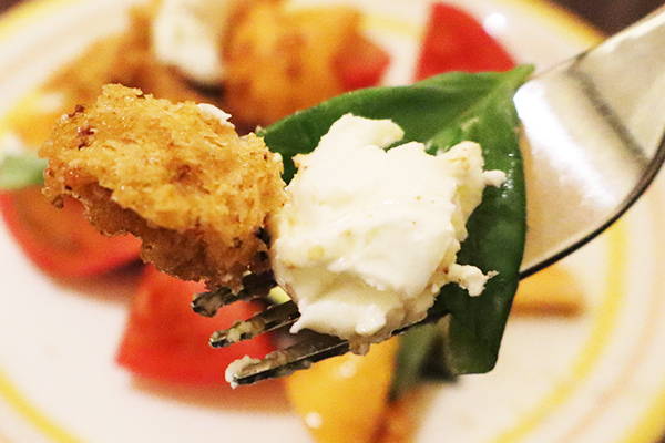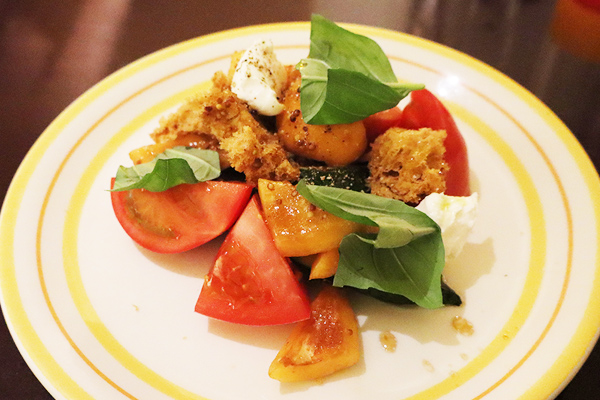 グリルドズッキーニと甘みの強いフルーツトマトに、ゴートチーズと旬のフルーツを合わせた一皿。中国黒酢「鎮江香醋」を使ったドレッシングが全体を引き締め、さっぱりしながらも奥行きのある味わいに仕上がっています。ヴィーガン対応(チーズ抜き)も可能で、軽やかに楽しめるのも魅力。
