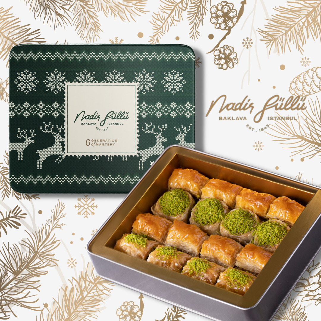 ウインターモチーフがあしらわれたボックス缶に、ピスタチオバクラヴァ、くるみバクラヴァ、ナーディルスペシャルバクラヴァ、パレスバクラヴァ、各種4個ずつ入った、ナーディル・ギュルのバクラヴァを思う存分お楽しみ頂ける贅沢な一品です。