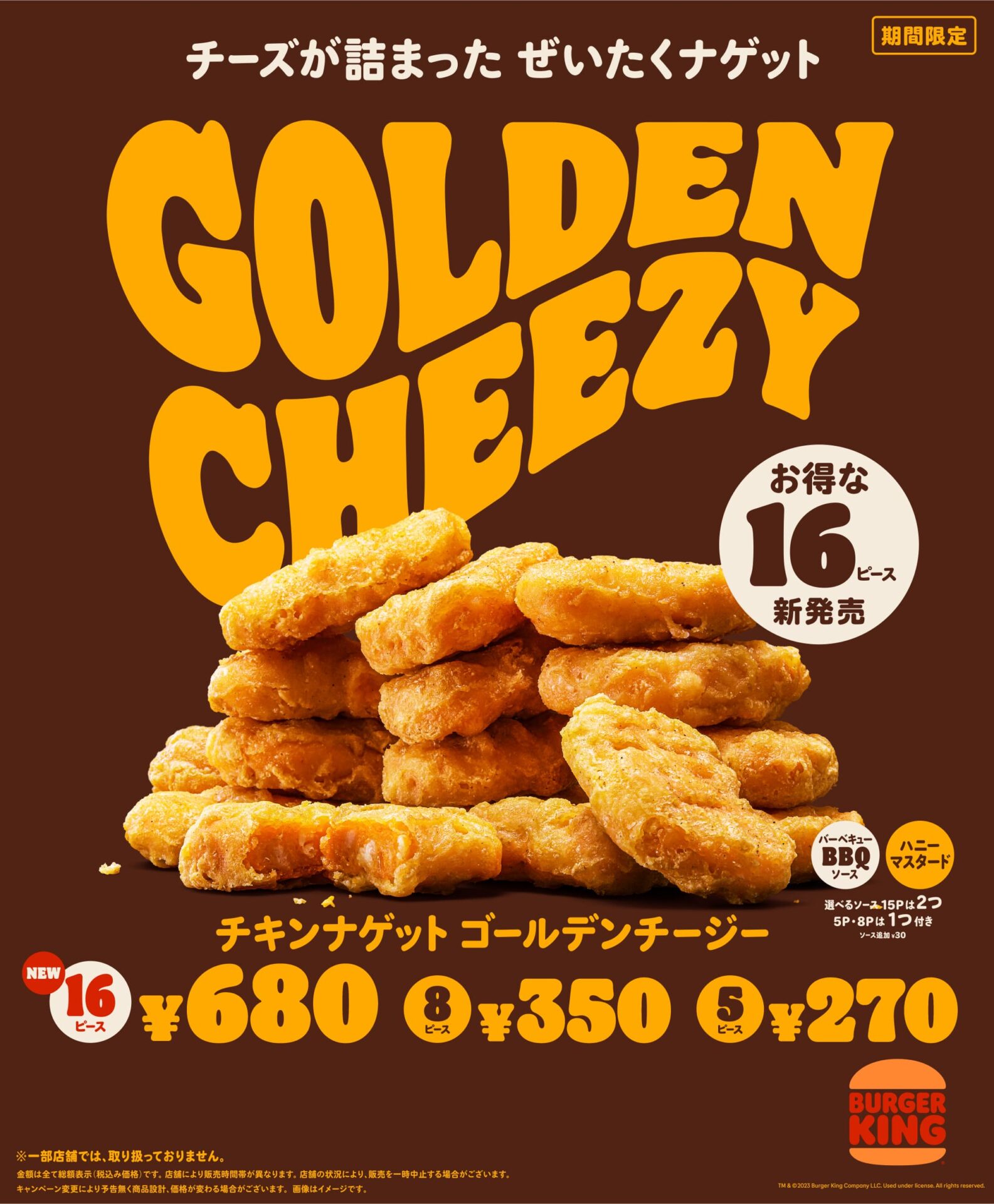コクのある濃厚チェダーチーズのリッチなおいしさが大容量でお得に楽しめる『チキンナゲット ゴールデンチージー』16ピースを、2023年2月24日(金)から期間限定で発売いたします。