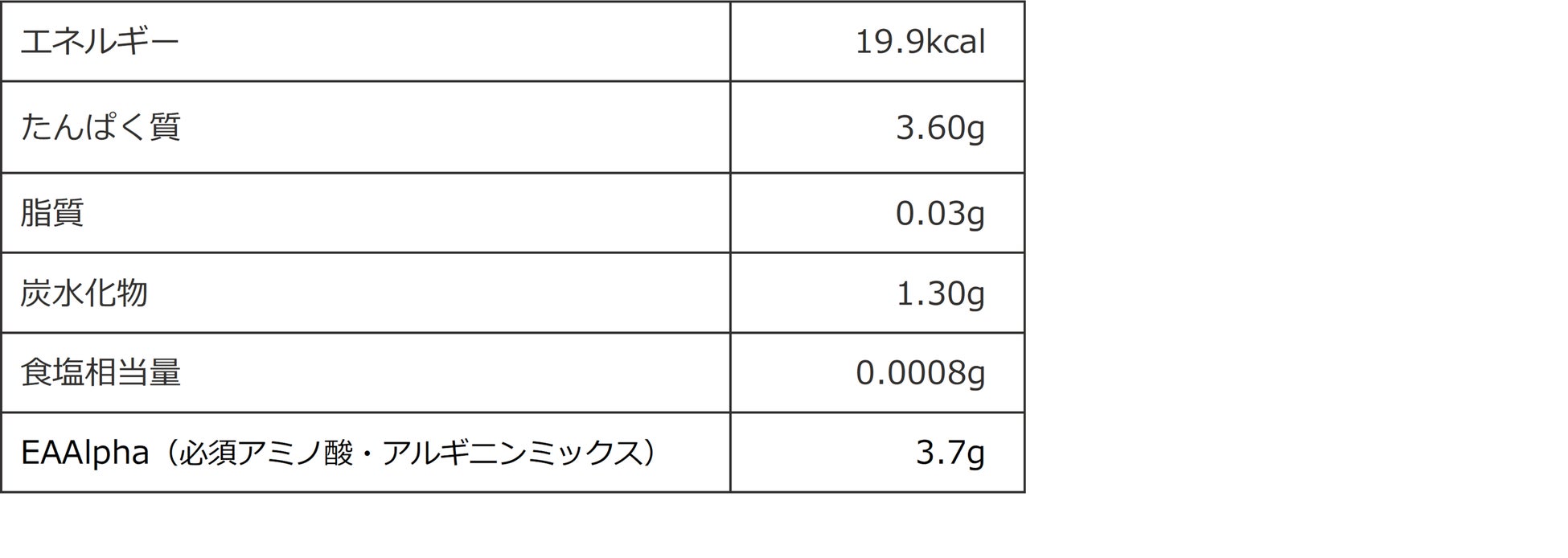 身体作りに必要な必須アミノ酸9種類とアルギニンの配合比率において、米国特許を取得したアミノ酸ブレンド「EAAlpha(イーエーエーアルファ)」で構成された国内唯一のEAA製品で、少量ながら高い筋合成(筋肉作り)を可能にします。本製品に含まれるアミノ酸3.6gを摂取した場合、ホエイプロテイン15g、もしくは一般的なEAA製品15gと同程度の同化作用があることがわかっています。少量で十分な効果が得られるため、食事への影響も少なく、女性や身体の小さいアスリートにもオススメです。