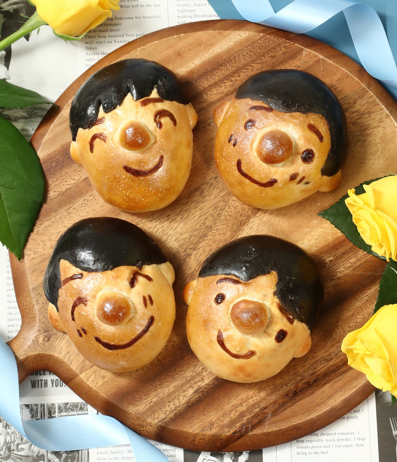 ふんわりとしたパン生地にチョコチップとくるみを包み、ブラックココア生地でヘアスタイルを作って焼き上げました。甘いチョコチップとくるみの食感がアクセント!いろんな表情や髪型の『パパパン』をご用意しています。