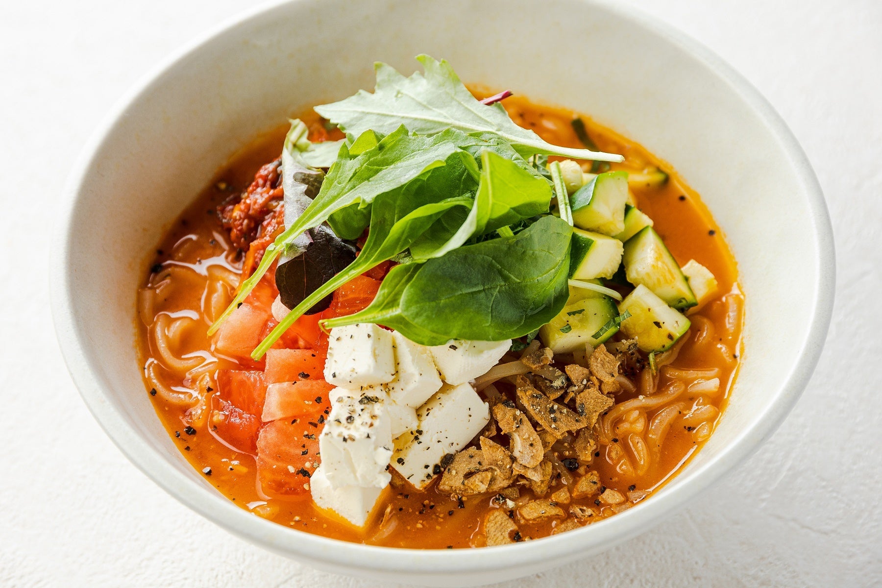 爽やかなトマトスープにピリッと辛いアクセントと、夏野菜のお供にクリームチーズをトッピングして色鮮やかな冷麺です。