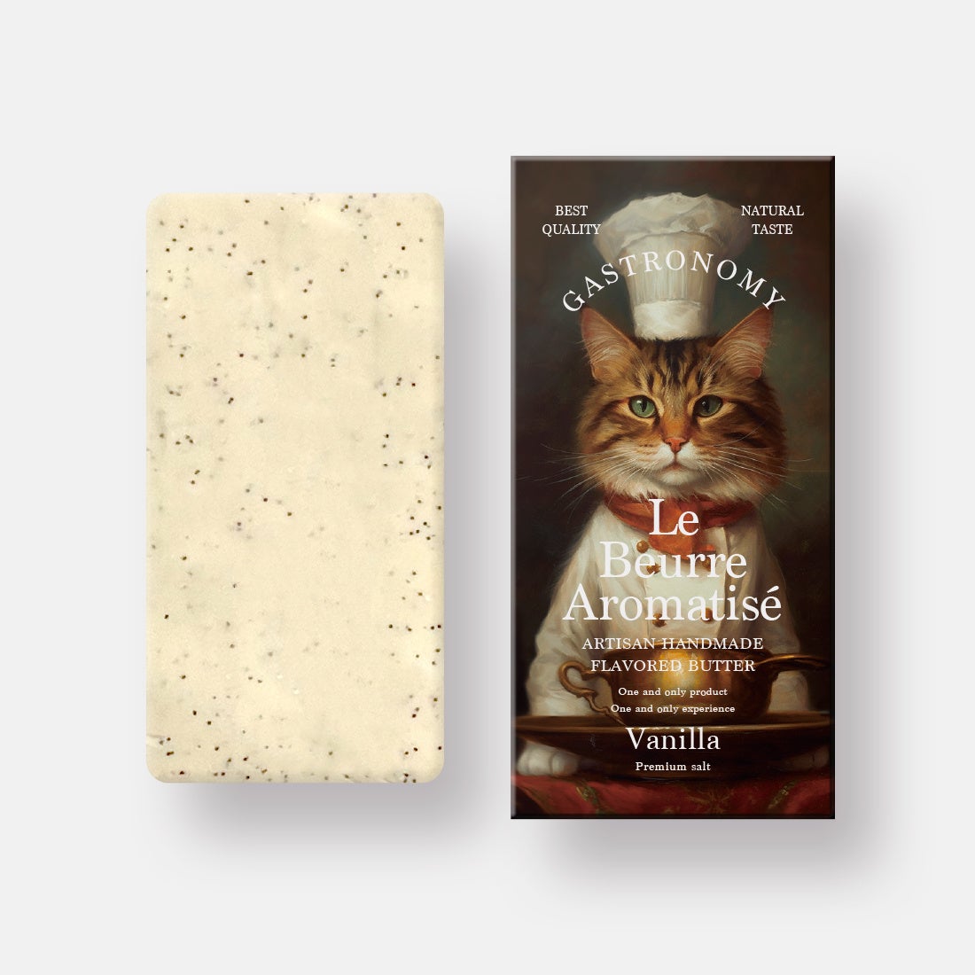 国産発酵バターとフレッシュバターにマダガスカル産バニラビーンズとゲランドの塩をブレンドしたカノーブル伝統的なフレーバーバターです。発酵バターの奥深いミルク感になじむゲランドの塩のスパイシーな塩味、バニラの粒々を噛みしめると口の中に広がるバニラの甘い香りが楽しめます。パンやクッキー、ケーキに塗って風味を引き立てるだけでなく、料理にアクセントを加えることもできる万能な一品です。贅沢な味わいを追求した塩バニラバターをぜひお楽しみください。