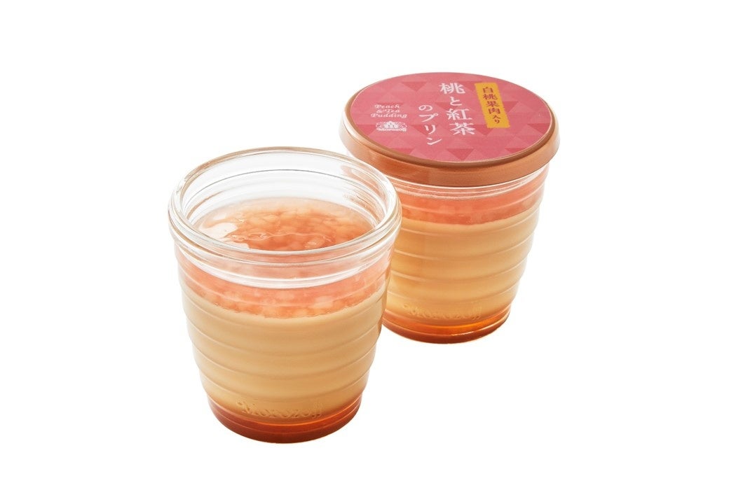 桃が香るミルクティープリンに角切りの白桃果肉がたっぷり入った桃のゼリーを合わせました。紅茶ソースの苦みと桃のゼリーの上品な甘みが重なり、夏にぴったりなすっきりとした後味に。とろける食感のミルクティープリンと、桃の果肉の食感を楽しむ果実感あふれるみずみずしい夏のプリンです。