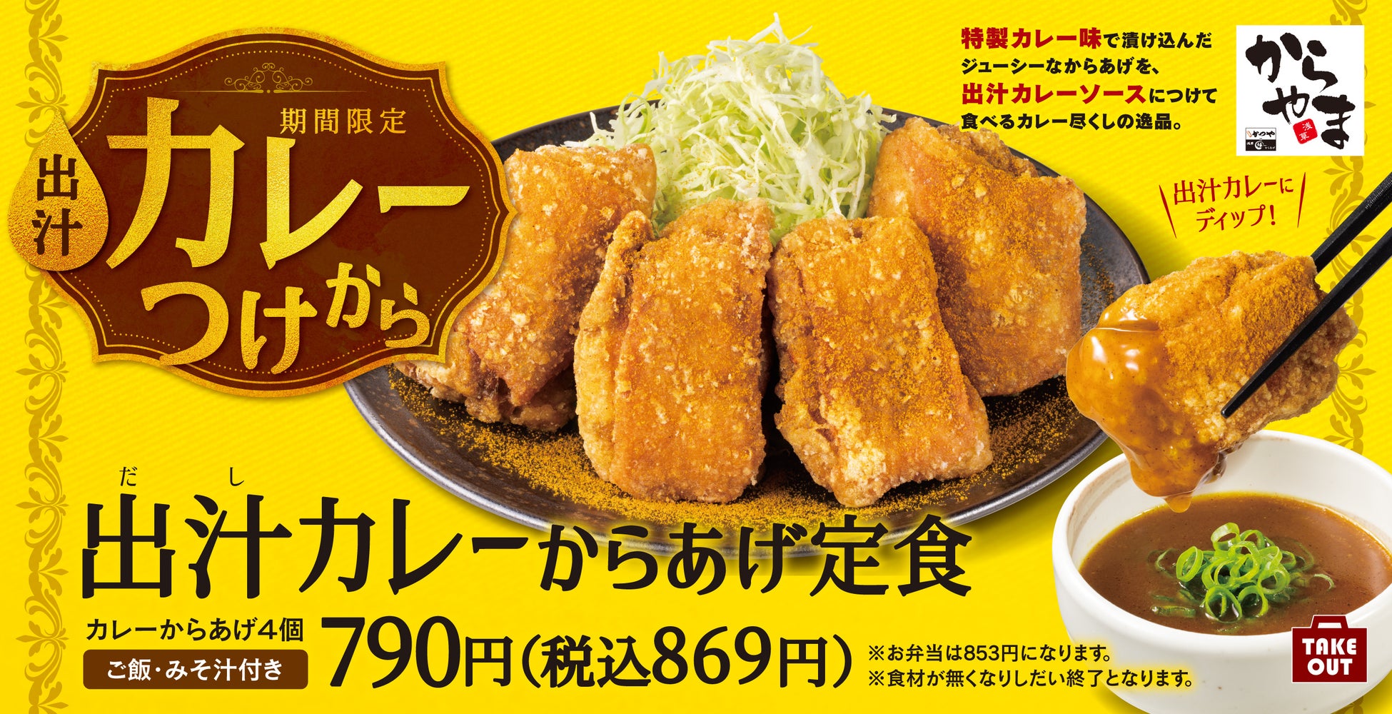 ご飯のおかずになるからあげ定食を常時11種類から選べる、からあげ定食専門店「からやま」にて、梅雨の蒸し暑さを乗り切り夏本番に向けた新メニュー「出汁カレーからあげ定食」を2023年6月16日(金)より期間限定で販売開始いたします。
