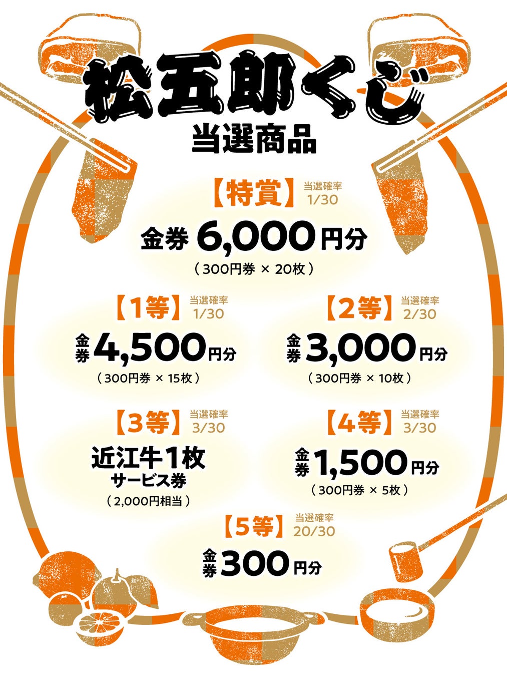 ”はずれくじ無し”ご来店者全員「松五郎くじ」が引ける!最大6000円分の食事券が当たる!