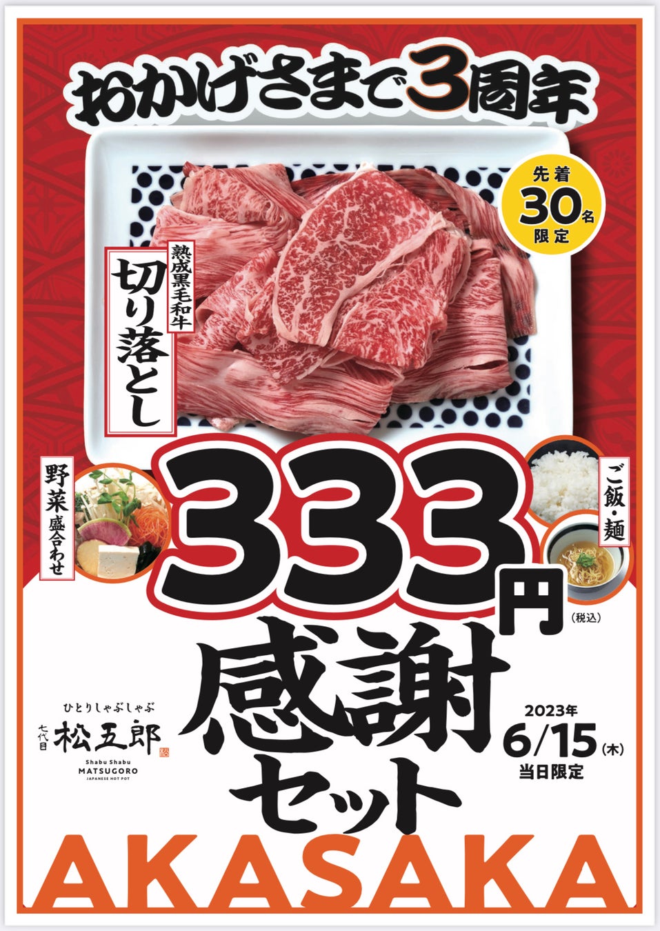 開業3周年記念【6月15日限定 】赤坂『ひとりしゃぶしゃぶ 七代目松五郎』切り落としランチ333円30食限定販売 その他当日限定企画盛りだくさん!