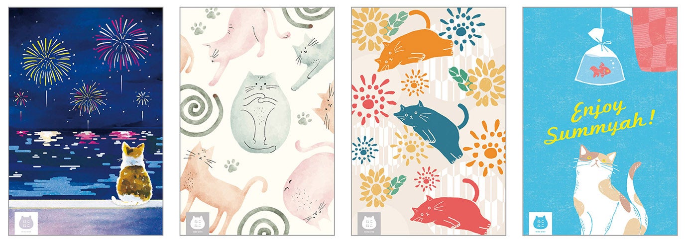 「ねこねこ」ブランドより、夏の風物詩をデザインしたポストカードセットを期間限定で新発売いたします。スイーツだけではなく、グッズとしてもお楽しみいただきたいという想いより、イラストが異なる4種類のポストカードをご用意いたしました。夏を思わせる爽やかな可愛らしいポストカード1枚と、「ねこねこ」で人気の焼き菓子『ふぃにゃんシェ(プレーン・ココア)』が1個ずつセットに。ポストカードはインテリアとして飾ったり、しおりの代わりとして本や手帳などに挟んだりと、用途は様々。ねこがあなたの日常に寄り添い、癒しをもたらします。ねこ好きさんへ、夏のギフトとしてお贈りいただいてもおすすめです。