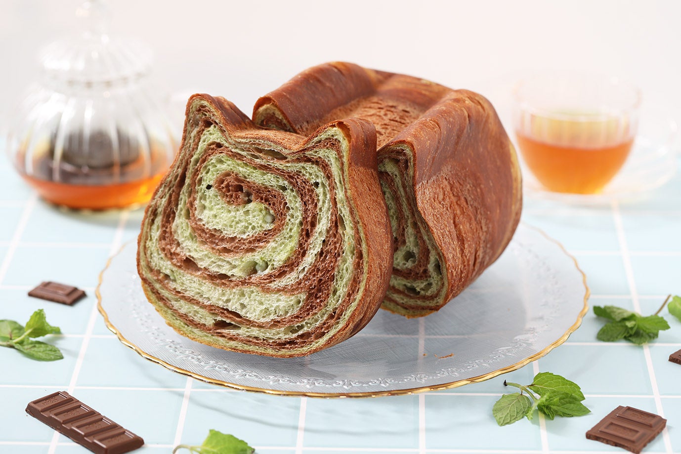 ねこねこ食パンのオンラインストア7月限定商品として、チョコミント風味に仕上げたねこねこ食パンが登場いたします。ミントのすっきりとした爽やかな風味が暑い夏にぴったりな清涼感のあるフレーバー。ココア生地と、ミントベースとミント風味のチョコチップを練り込んだ生地を巻き上げて焼き上げました。ねこねこ食パンのミルキーな味わいに、ココアの甘い味わいとミントのすっきりとした風味でマイルドな爽やかさをお楽しみいただけます。遠方にお住まいの方へ、夏のギフトとしてもお贈りいただけます。