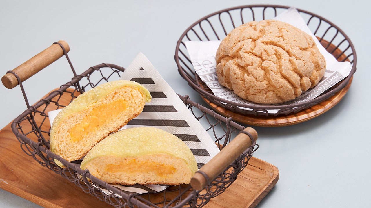 「北海道メロンパン」は、メロン風味のパンに、北海道メロン果汁入りのメロンクリームを包みました。メロンのフルーティな香りが口いっぱいに広がります。