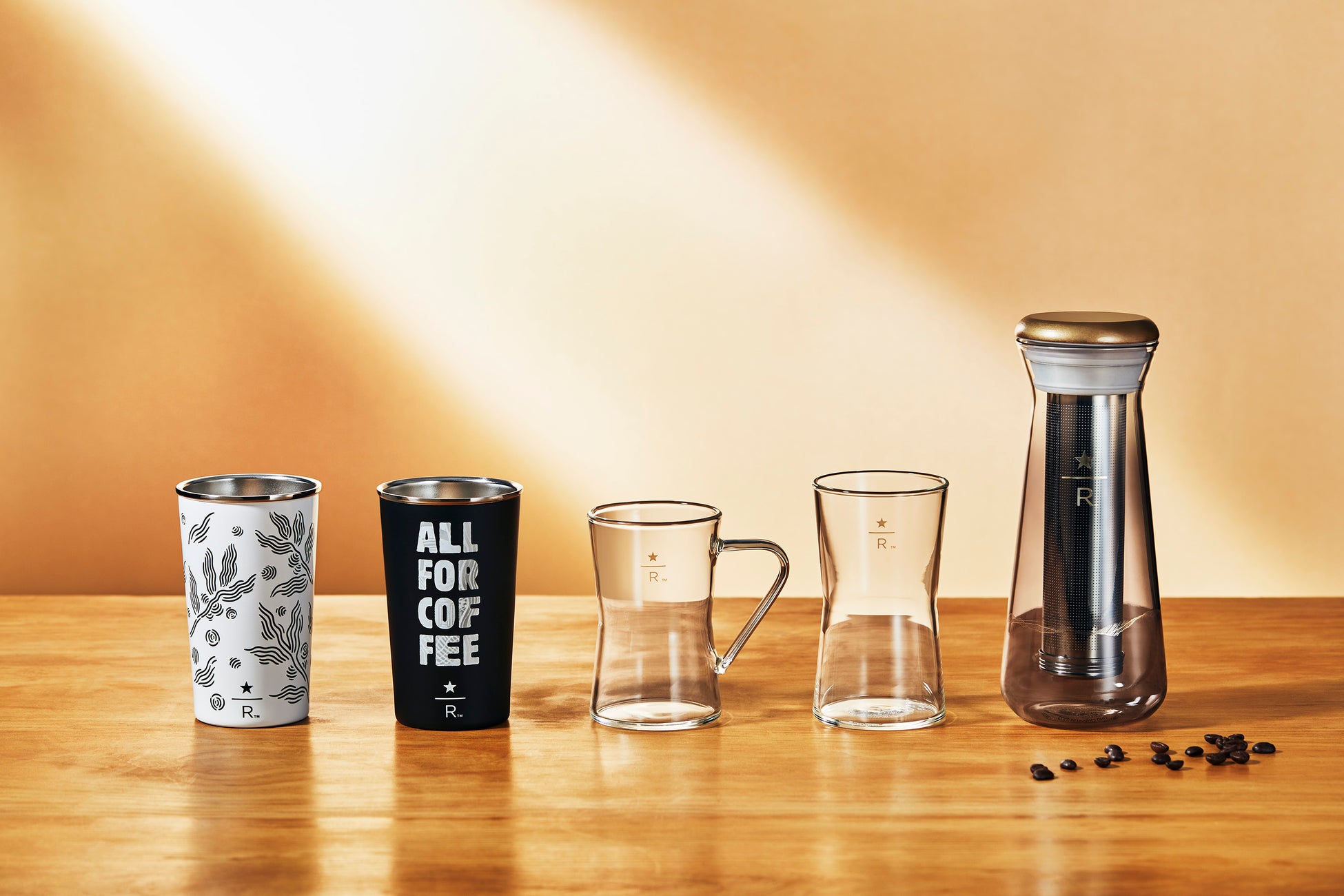 | ■商品名・価格:[※表示価格はすべて税込価格] 左から ①『スターバックス リザーブ® ステンレスカップCOFFEE LEAVES 355ml』 ¥3,500 ②『スターバックス リザーブ® ステンレスカップALL FOR COFFEE 355ml』 ¥3,500 ③『スターバックス リザーブ® ロースタリー サイロハンドルグラス296ml』 ¥2,600 ④『スターバックス リザーブ® ロースタリー サイログラス355ml』 ¥2,600 ⑤『スターバックス リザーブ® コールドブリューメーカー』 ¥8,800 ■取り扱い店舗 ■販売期間 |